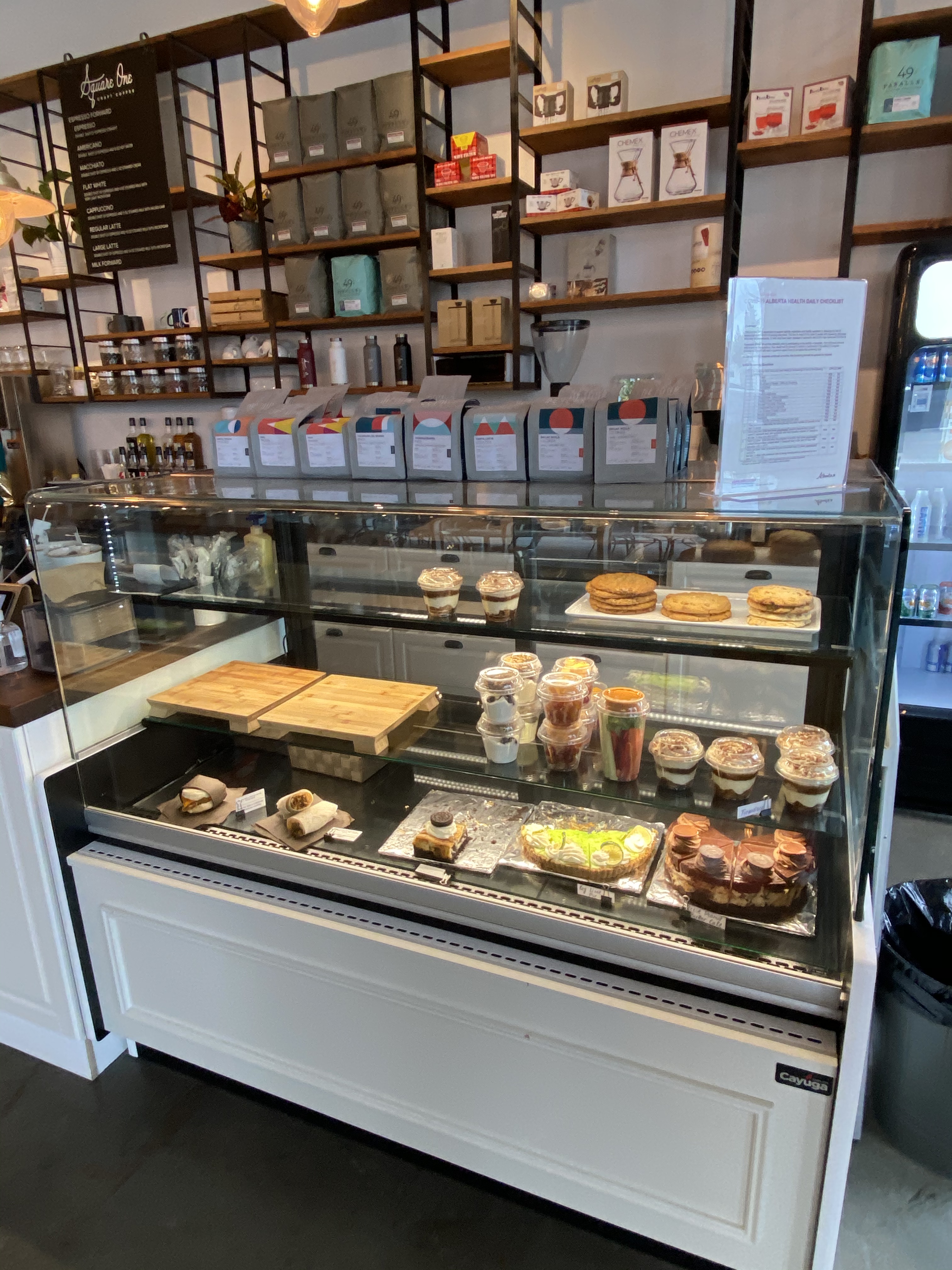 It was very bright and open with a really unique roof which was amazing. This location was very beautifully designed. They have a shelf of coffee and branded products for sale followed by a long counter of food and their coffee machine. The food looked really amazing and we were sad that we didn’t get anything to try. We were sad that there was no pricing on any of their products so we would have to ask about everything. They are a company that supports local Canadian roasters and they are going to have a rotating local roaster every month to month and a half.