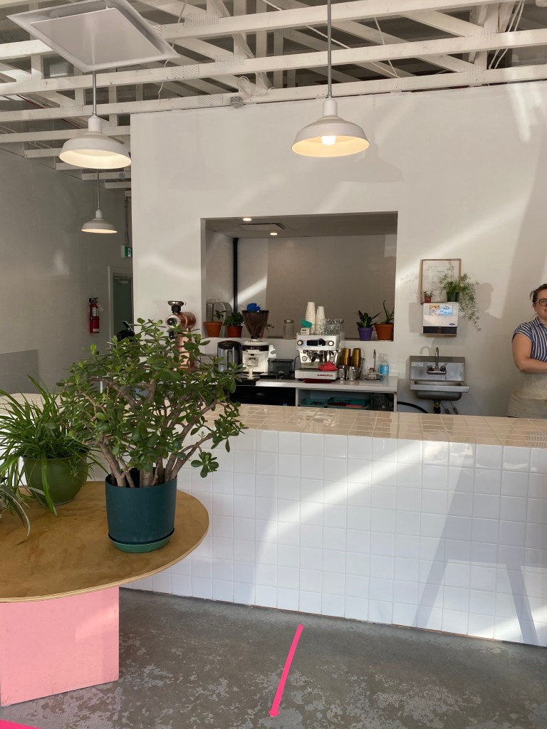 Inside they have concrete floors and white walls, it is very industrial looking which is really nice. They have a long bar in the centre of the location with the kitchen located behind the bar. They bake everything in house and their menu is small on the wall to the left.Â