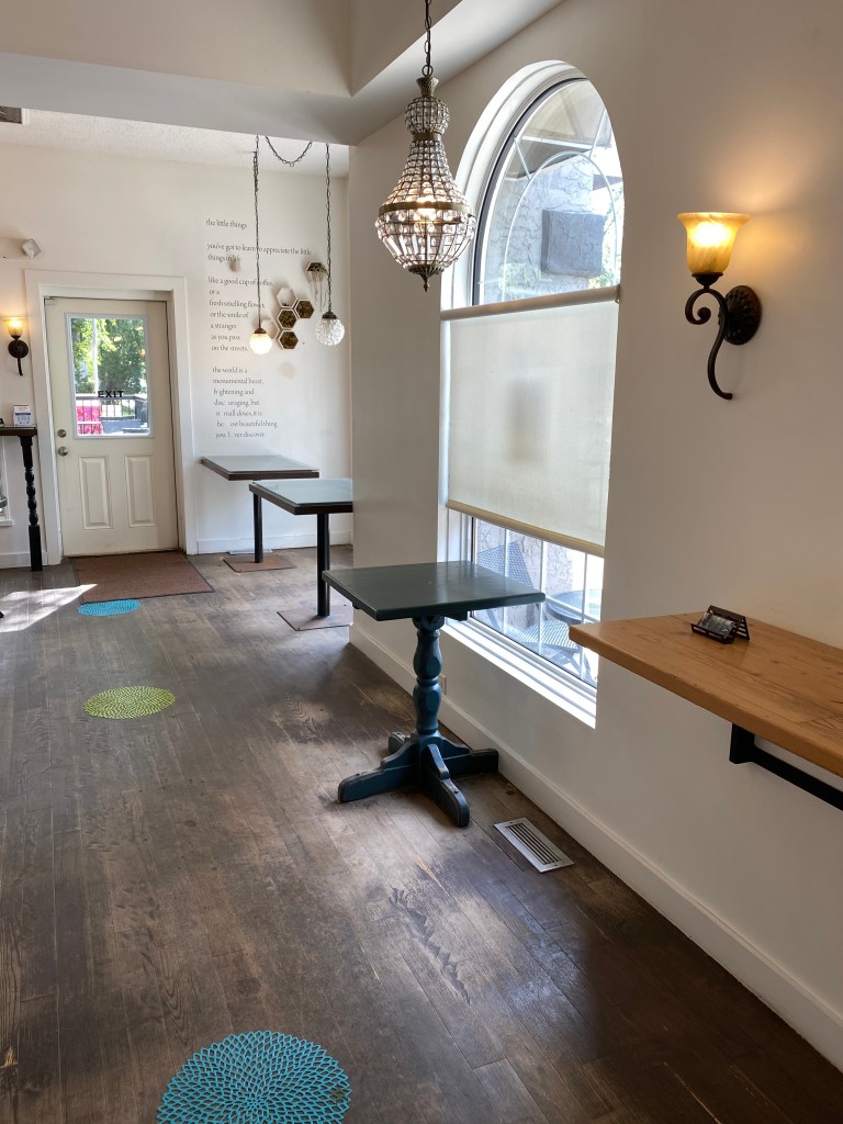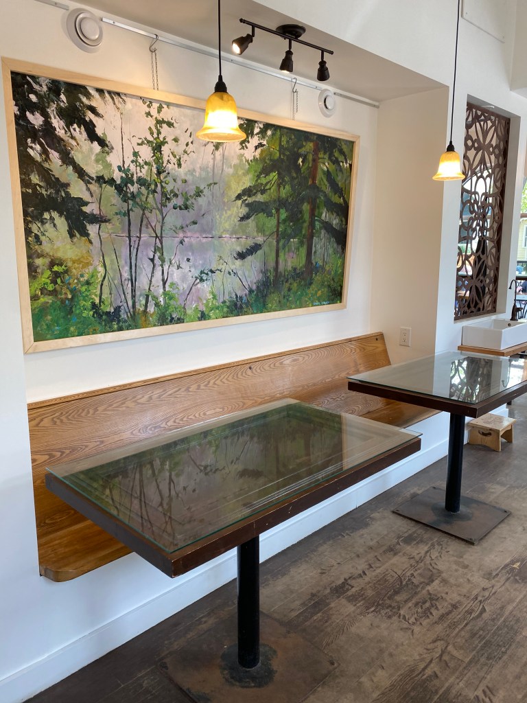 You enter at the one side and immediately there is the bar with all their machines and to the right there is a shelf with t-shirts for sale. There is paintings up on all the walls as well as mirrors. There is one wall made of scrap mouldings which was really cool and creative. Near the other side of the shop there is a bunch of seating with comfy couches and tables. When you exit the far door you come to a really big patio that was full of a bunch of people.