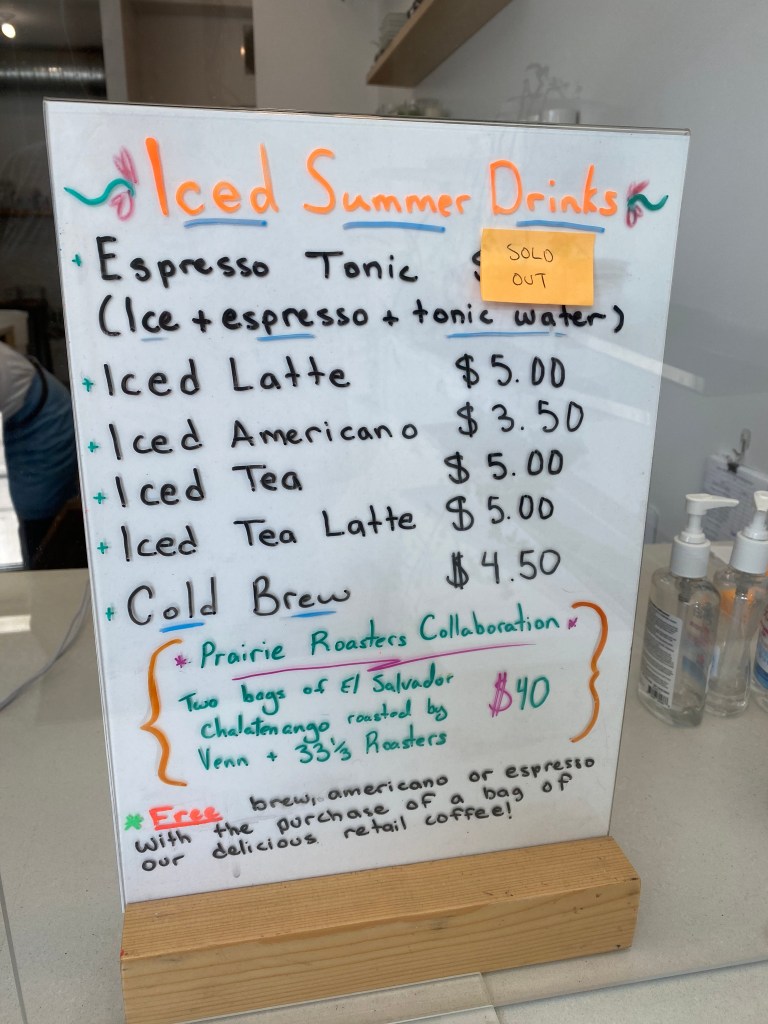 As soon as we arrived in Saskatoon we decided to find a coffee shop that was actually open on August 3 and there was one location. We went on the hunt to find Venn Coffee Roasters. They are located behind a building in an alley so if you were just driving by, you wouldn’t even know it was there unless you were looking.