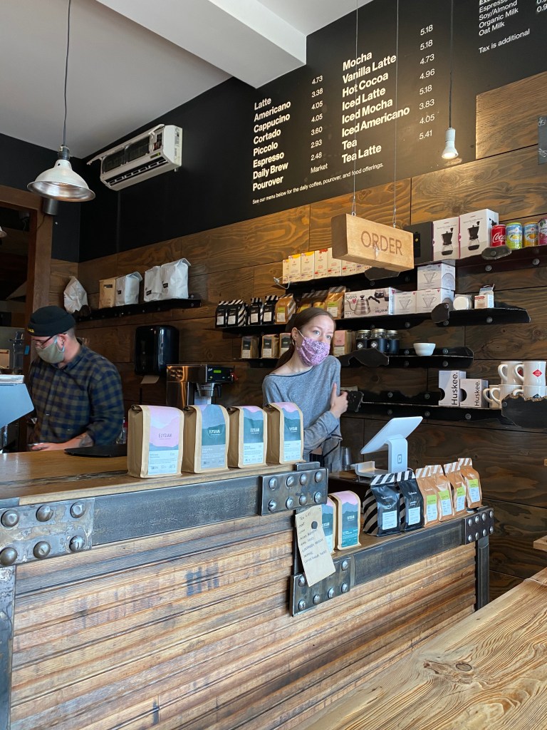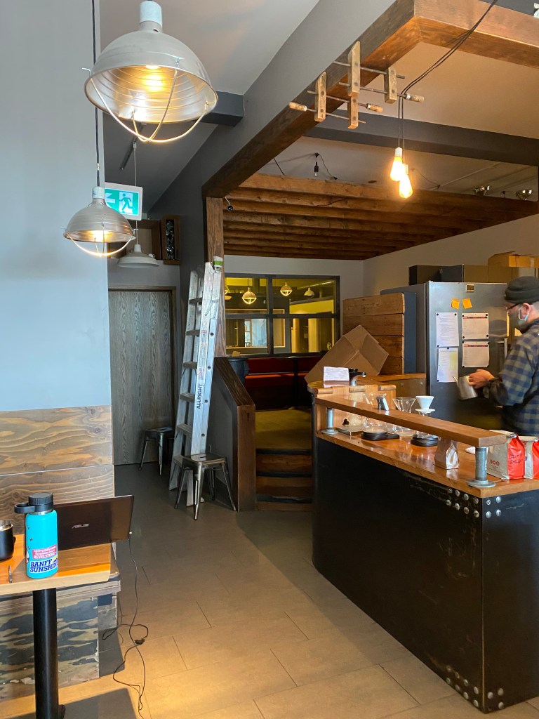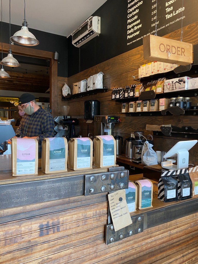 Their was a big garage door located in the front and on the inside there was some seating surrounding the bar. At the back of the cafe there was more seating which was nice to see. The bar had a great selection of coffee and tea options which is always a bonus when they carry a couple different options. The coffee selections were between Timbertrain and Elysian which are both located in Vancouver.