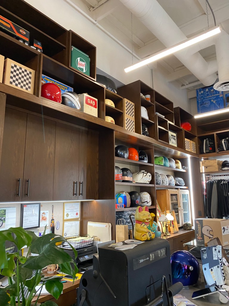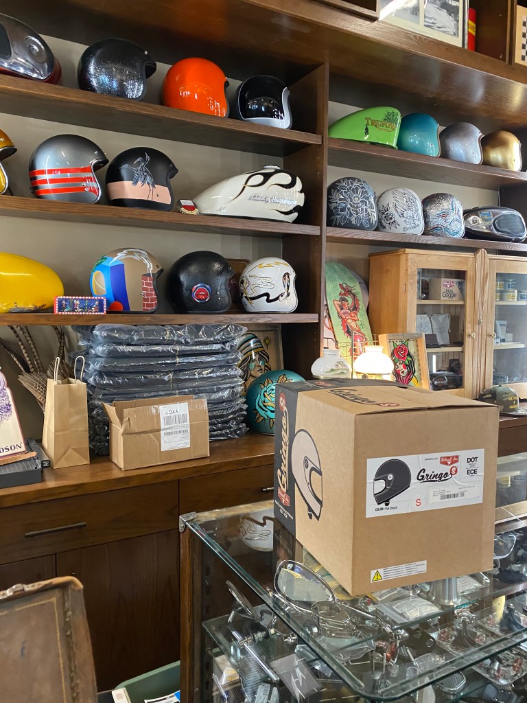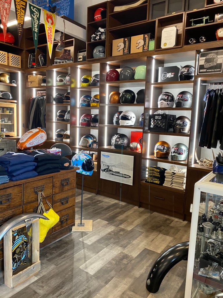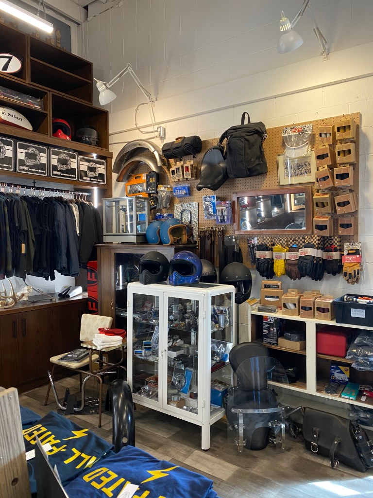 When you first walk in you are in a motorcycle shop, there is helmets, clothing, hats, vests, everything you would need if you owned a motorcycle. There is a wide opening at the back where you can look into the shop and see a bunch of motorcycles that they are working on. On the far left of the main store there is a small bar with seating for six and their coffee machine.