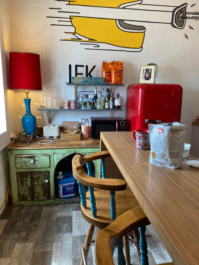 The staff were very friendly and welcoming into the shop. She gave us a quick tour and showed us into the garage and if it wasn’t COVID you would be able to sit in the garage and enjoy your beverage and watch them work on all the motorcycles they had.