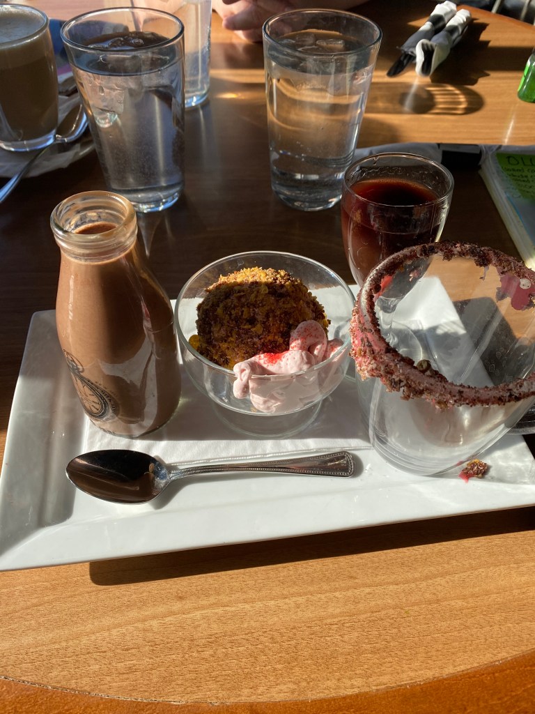 This is always a fun favourite hot chocolate of ours. We love the personalized aspect of this drink, you get to make it how you want. Cravings gives you all the pieces and you put it together. They give you an empty glass, some deep fried ice cream, some whip cream and a glass of hot chocolate, and since we did the alcohol one we got a mini flute of the gin and chocolate liquor. You get to make it how strong or how weak you would like.