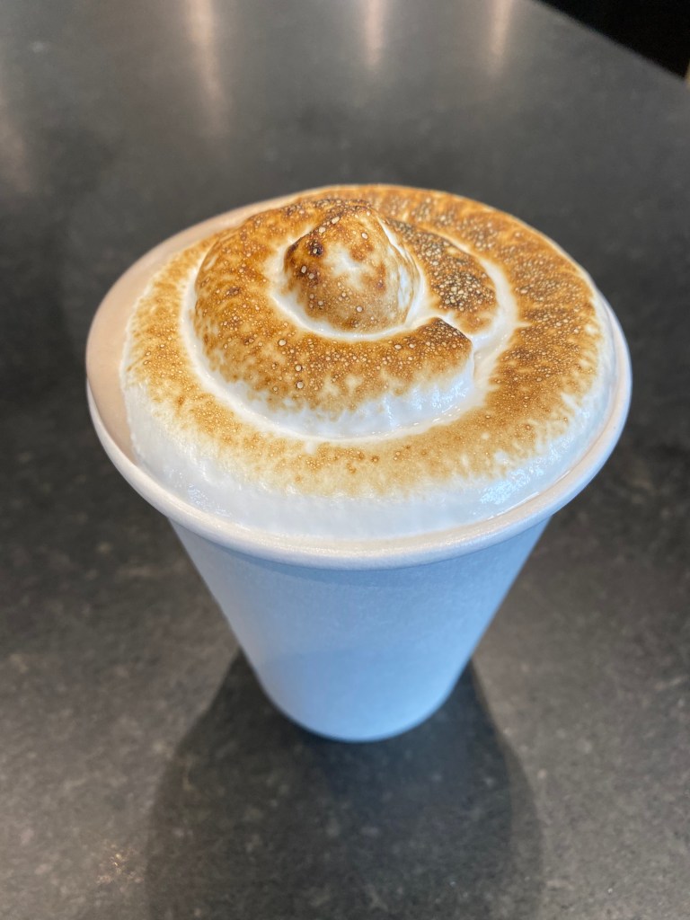 “A rich and creamy base of milk chocolate hazelnut gianduja with toasted Italian meringue floated on top.”
