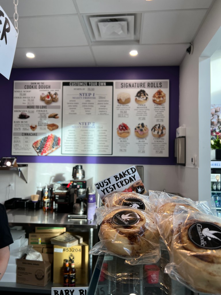 When you walk in there is a counter with a couple seats to the right and behind that there is a very long service counter where you can watch them make your hand crafted cinnamon buns. On the left near the end of the counter there is a spot that there will be a couple seats that you can sit and enjoy. It is very bright and smelled absolutely amazing in there. They have their menu quite big behind the counter which was absolutely amazing, this way you can see everything that they offer in one location.