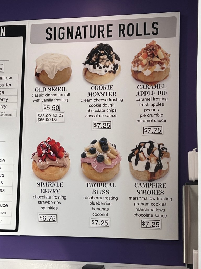 When we walked in there was such a great smell we got super distracted by how amazing it was in there. The worst part was that my daughter selected what we were getting which means she got a bunch. They have six signature cinnamon buns that we got to try and then we picked up one more. The cinnamon buns we got were;