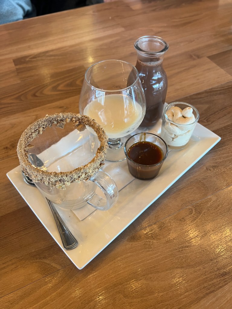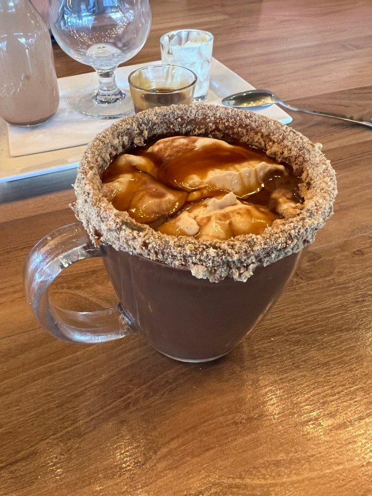 The salted peanut and caramel whip was outstanding you could have ate it just by itself. Our alcoholic hot chocolate came with Cadello 88 and Rum Chata so it was a little more boozy than expected. Once everything was mixed together and sat for a couple minutes it really tasted amazing.