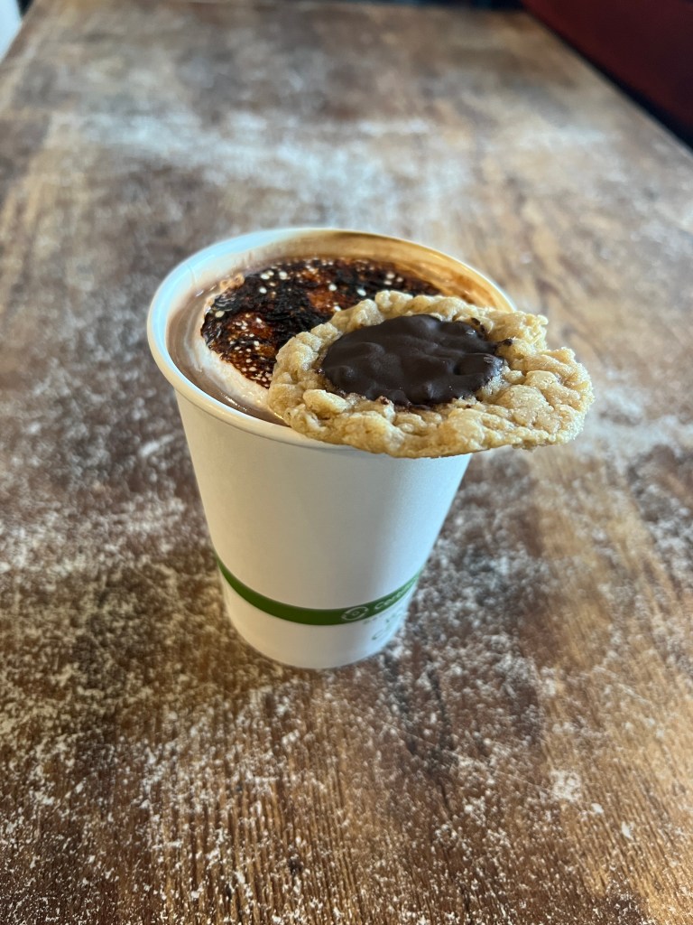First I have to say that I absolutely love that it is a homemade marshmallow and a homemade cookie, it really elevates the drink to the next level for sure. This drink has an amazing chocolate flavour and once you enjoy the cookie, as you sip the drink you get a little bit of marshmallow in every sip because of how it slowly melts into the drink. This is a very good drink, I do wish that it was hotter temperature wise because it didn’t stay hot very long. Also I wish that they would have added some graham cracker flavour to something to really bring in the S’more flavour that much more.