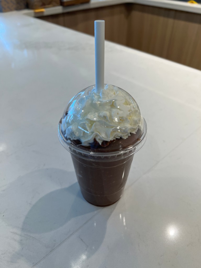 This frozen hot chocolate is absolutely delicious. Very chocolatey and creamy, plus we love the fact that they upgraded one of their current smoothie options to make this drink. It is a very healthy drink in that it has chocolate almond milk, avocado, cocoa powder, dates, cinnamon, vanilla, honey and hemp chocolate protein… all those flavours make a delicious frozen hot chocolate. Sadly they did use canned whip, I wish that they could have done an avocado whip or vanilla whip or something like that to really push this drink over the edge of aweseomeness.