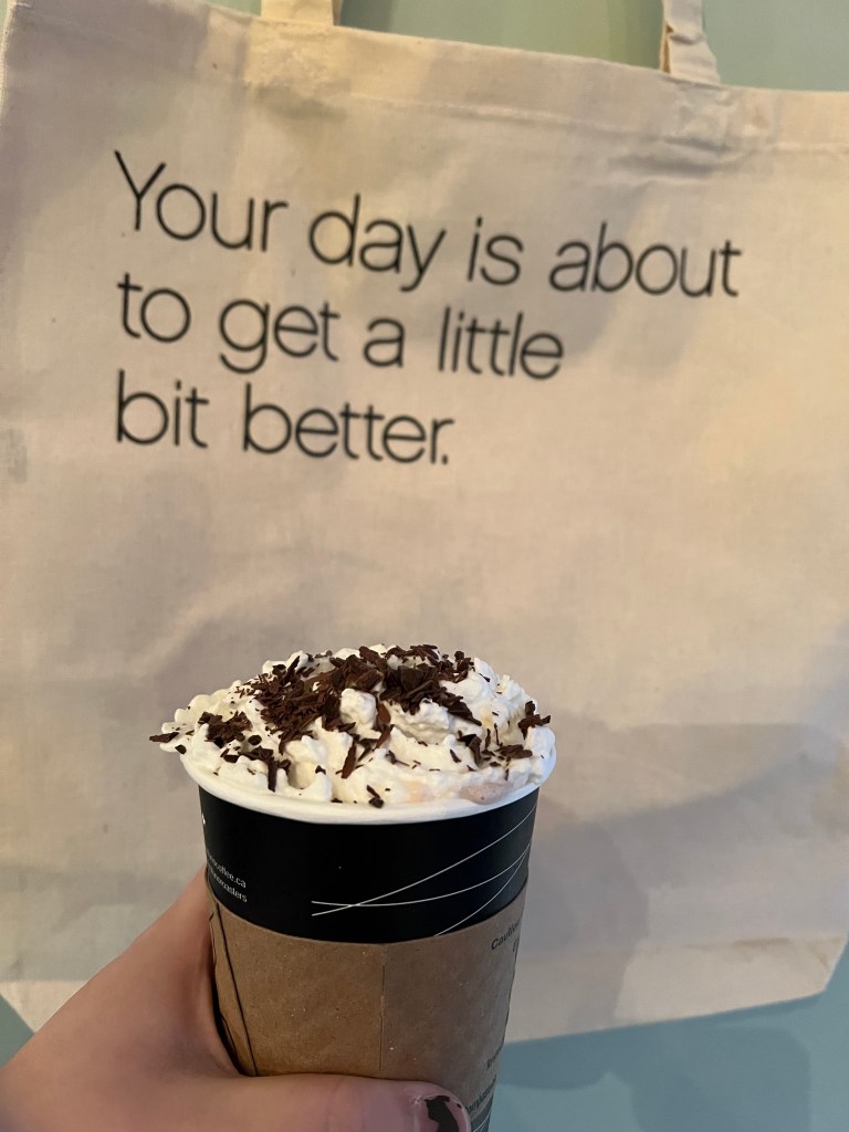 This hot chocolate has a great cinnamon flavour throughout the whole drink. The cinnamon is not overly strong which is really nice, sometimes the strong cinnamon flavour is not very good. It is a very warming hot chocolate for sure. We were happy to see that they used real whipped cream which brought the drink to the next level. The chocolate shavings on top were very good and a good addition to the hot chocolate. Well done.