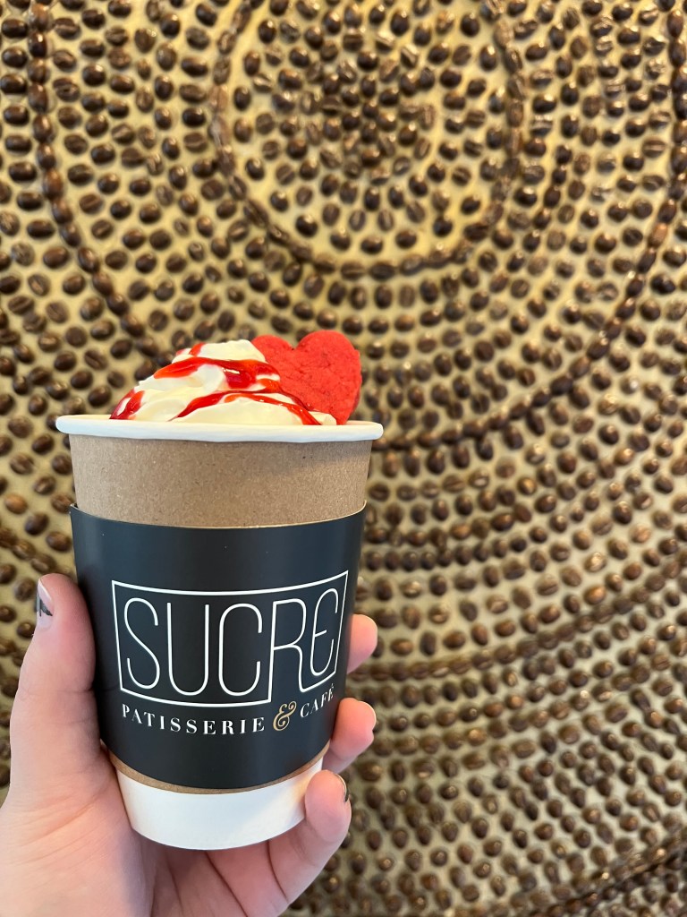 “If you love our strawberry cheesecake, you will love our strawberry cheesecake hot chocolate. Hot Chocolate is made with house made strawberry compote, cheesecake foam, topped with whipped cream, strawberry and cheesecake drizzle, and finished with our heart shaped shortbread cookie.”