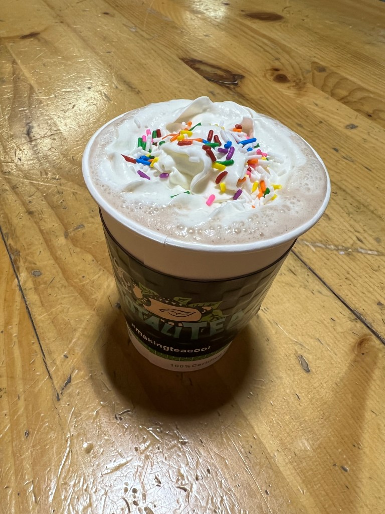 “This creation begins with our “Double Chocolate” black tea blend, blended with cocoa powder, hazelnut syrup and white chocolate. Have it your way with Dairy or milk alternatives. Topped with whipped cream and rainbow sprinkles.”