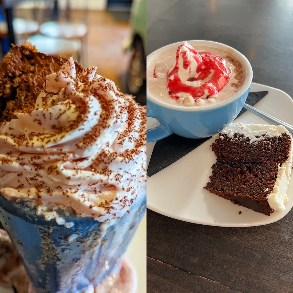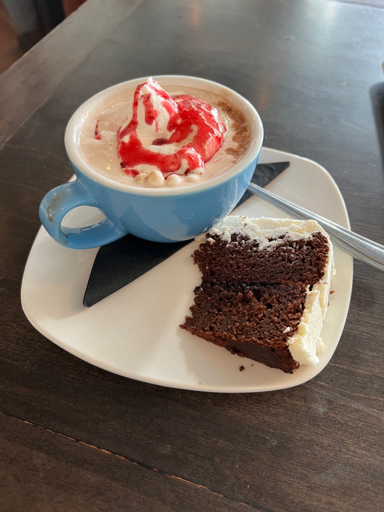 “Dutch pressed cocoa powder, nutmeg, cinnamon hot chocolate with a drizzle of cherry kirsch syrup, topped with cherry whipped Chantilly cream and a sprinkle of dark chocolate shavings garnished with a wedge of house made black forest gateau with a cherry on top!”