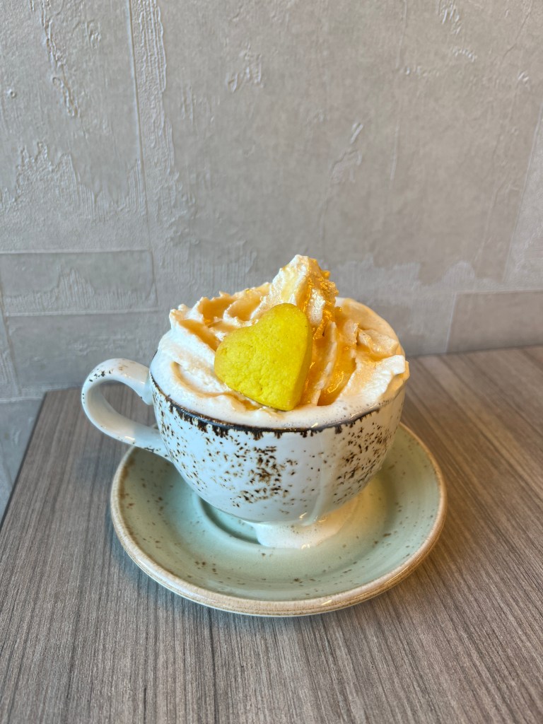 “The Heart of Gold is a warm and playful fusion of the rich buttery caramel flavour of gold chocolate, the smooth taste of homemade caramelized honey butter syrup, and paired with a savoury twist of smoked peppercorn & black hawaiian sea salt. It is then topped off with homemade Dulce de Leche whipped Cream, a homemade apricot coulis drizzle, and a garnish of edible gold glitter. The Heart of Gold is dedicated to you, our abso-friggen-lutely stellar local community that makes Calgary the amazing city that it is. And with part of the proceeds going directly towards Calgary Meals On Wheels, let’s go out there and make a difference 💛.”