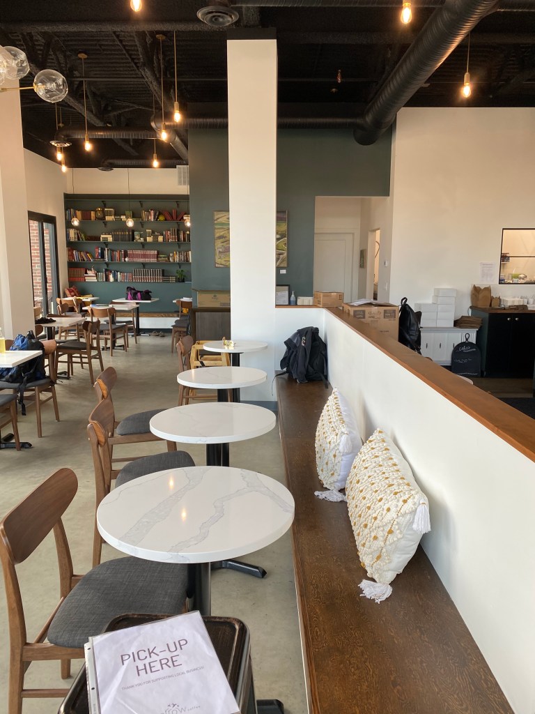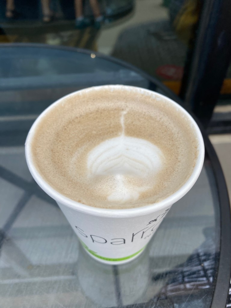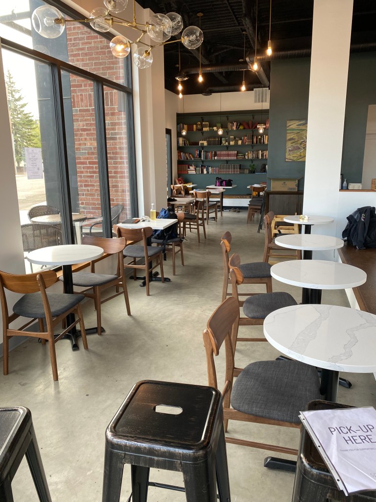 Since it is COVID times we couldn’t enjoy the drinks inside, but when we went in to order we got a chance to take a look. After you enter, to the right there is shelves with books and the coffee that Sparrow is selling. They include Transcend, Luna, Rogue Wave, Rooftop, Quietly, and Phil and Sebastian. It is a really great selection of Canadian Roasters. Beside that they have their bar which is normally filled with baked goods that they make in the kitchen behind the bar. There is a bunch of seating inside and near the back of the shop we noticed that there is accordion doors that would be really nice to have open on warm days like today.