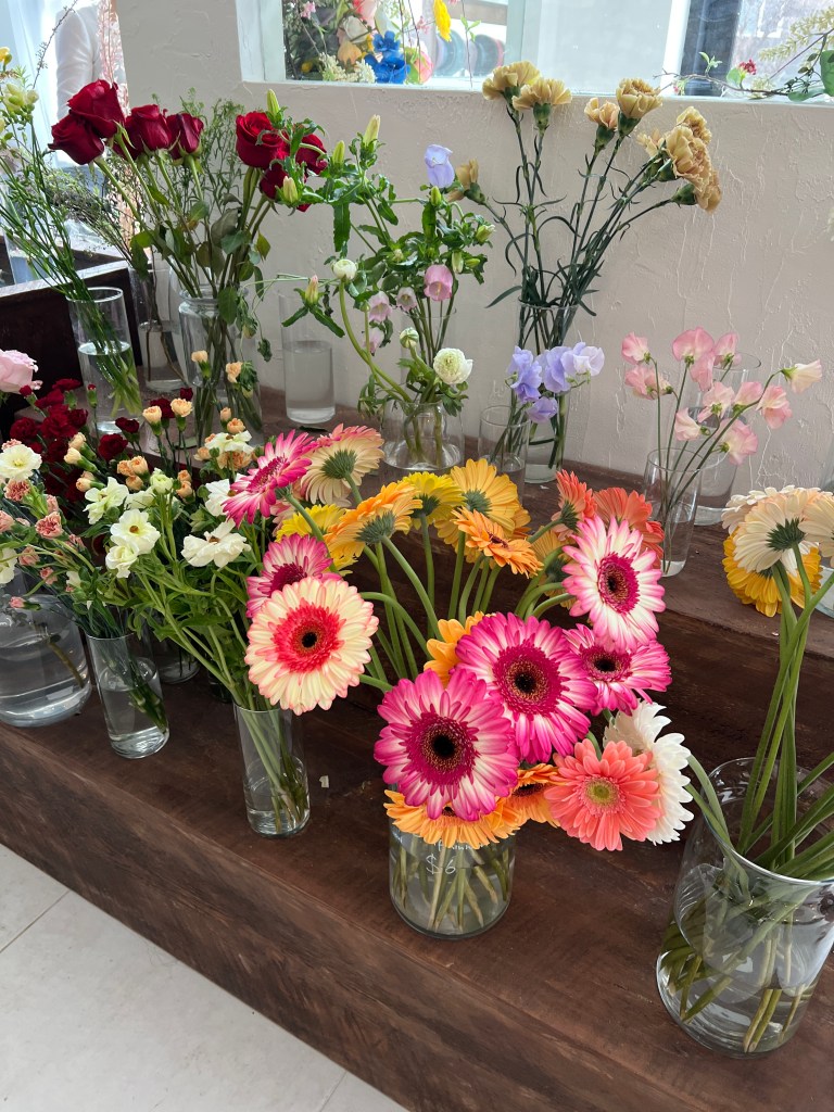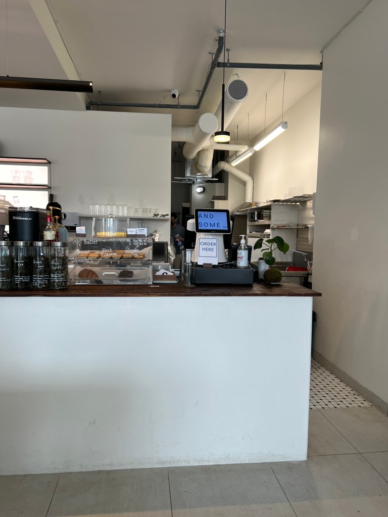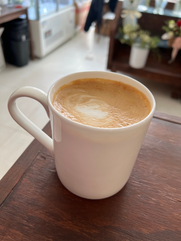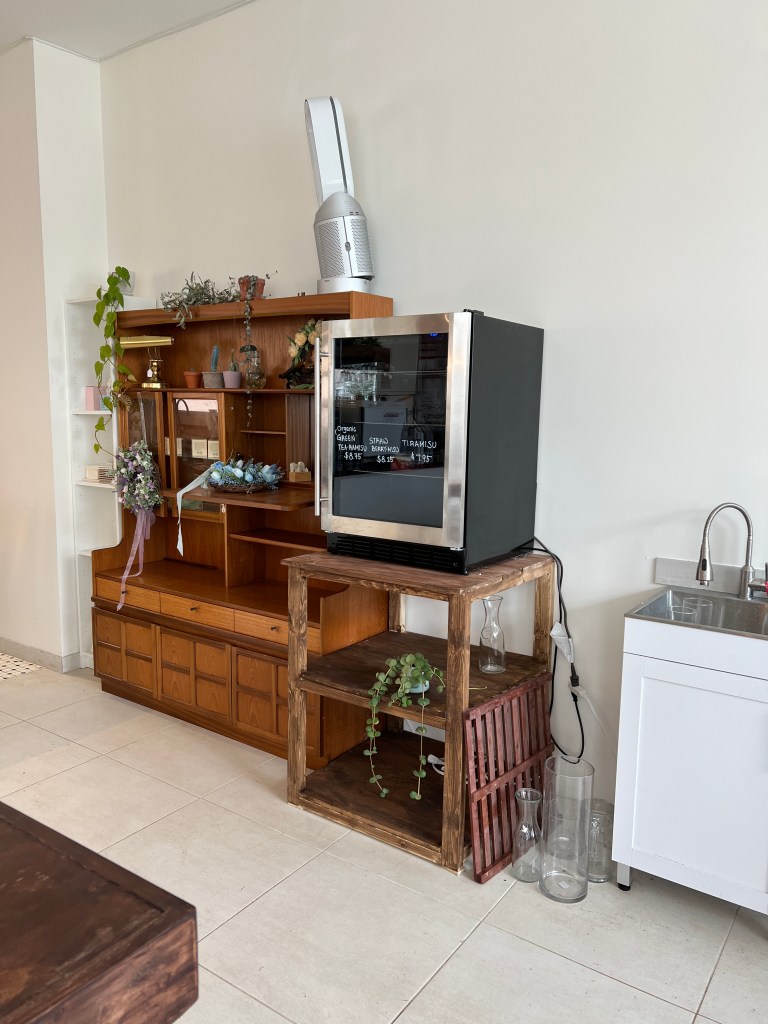 When you walk in you are immediately greeted by a wall of flowers and then you enter to the slight left. There is a family style table in the centre and then all along the left side there is a few tables. When we arrived it was very busy, thankfully a very nice family was just leaving and they gave us their part of the family style table. At the front on the right there is a cute little flower shop that you can purchase single stems or bouquets. On the right before the order table there is a mini cooler that only had a couple items in it today, two delicious kinds of tiramisu (obviously got one of those), and then shelves which I can only assume will hold something soon. Then there is a big counter where you order, they have a couple items there that you can see and purchase as well such as cookies and the cutest presentation of a slice of cheesecake.