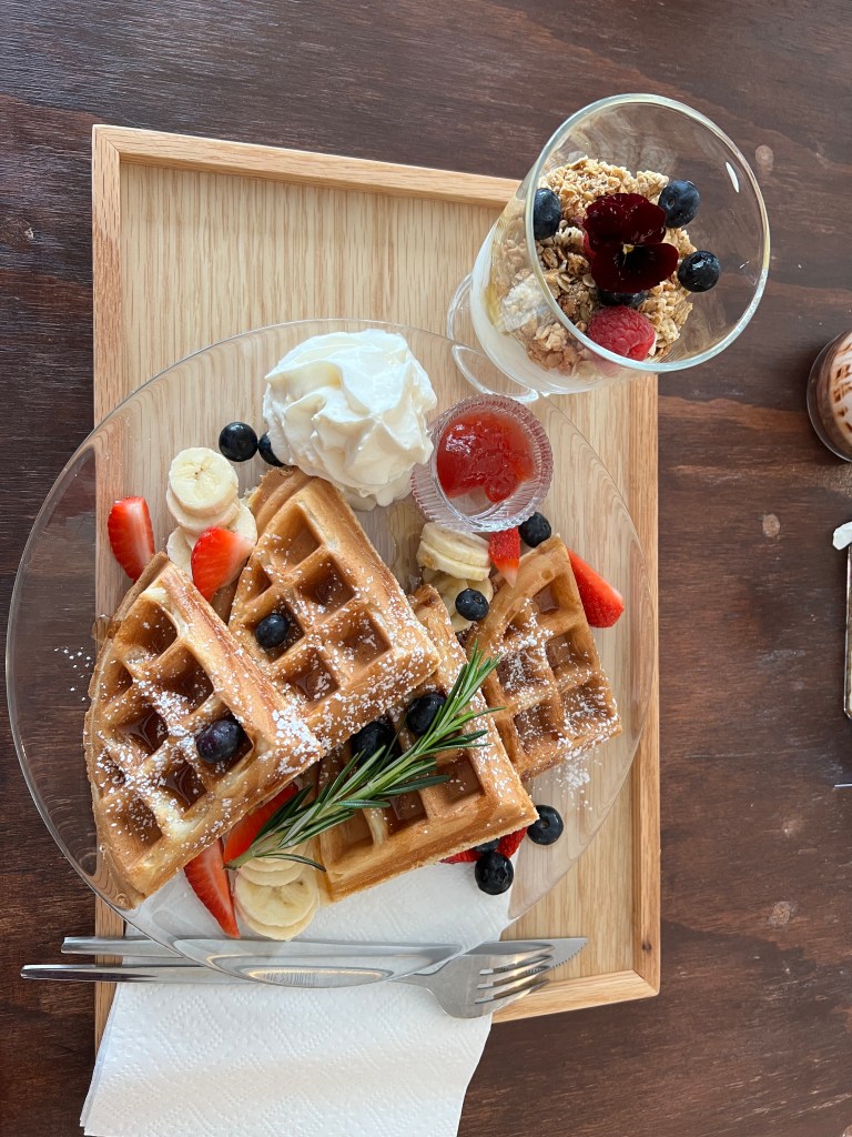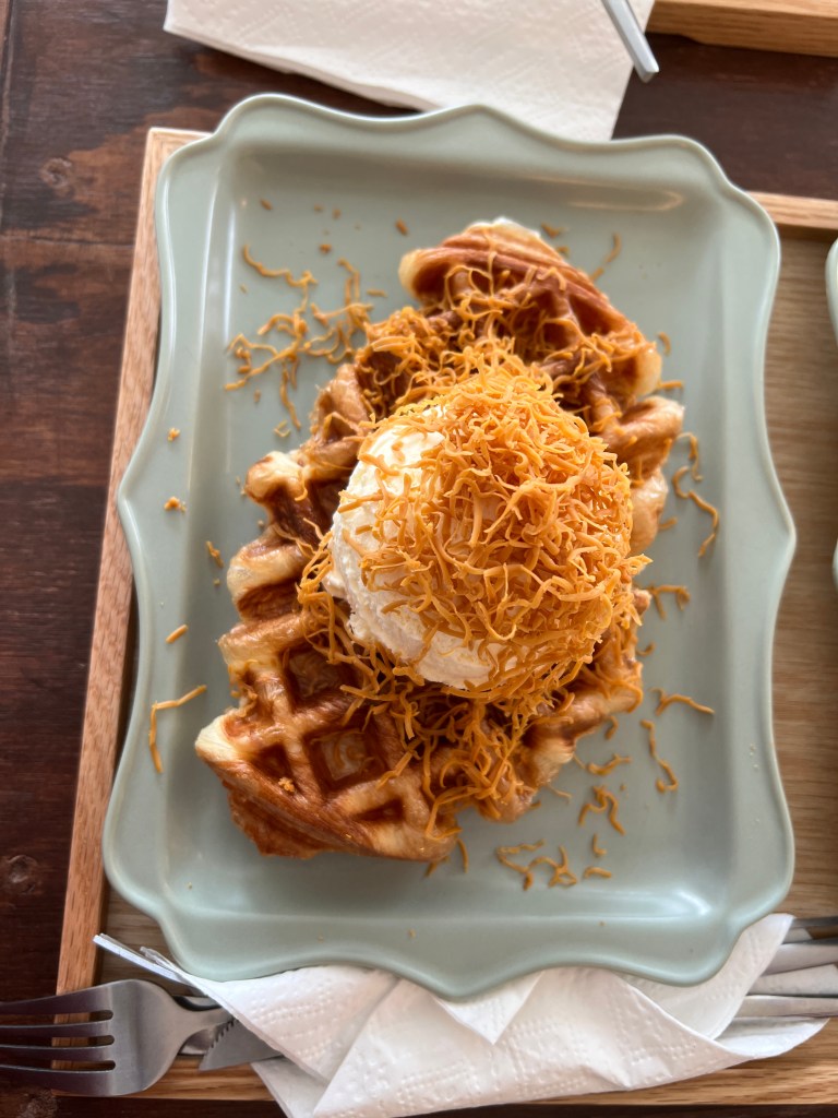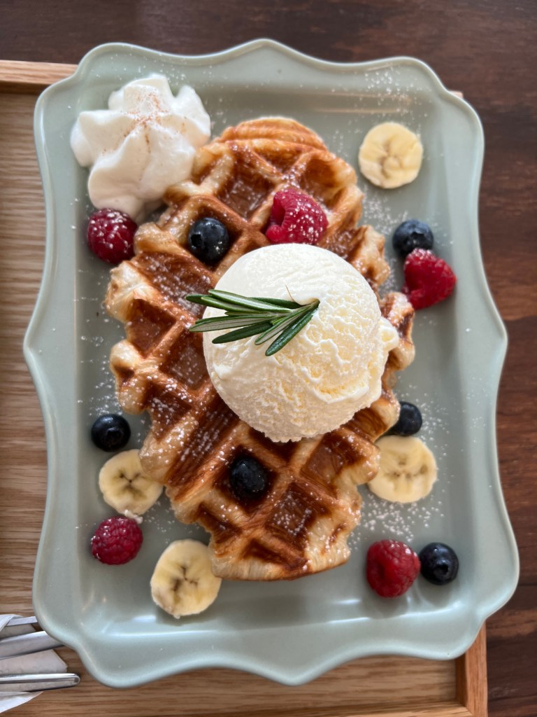 I ordered the Brown Cheese for $9.95, it is a croissant that has been pressed in a waffle iron topped with vanilla ice cream and shredded brown cheese. Now some of you may think that is crazy, but the flavours all together were absolutely delicious. If you tasted the cheese by itself it almost tasted like a smoked cheese of some kind. With the blending of all the flavours it made the crowaffle (new term, I think so) sweet which was crazy since my meal seemed a little more savoury.